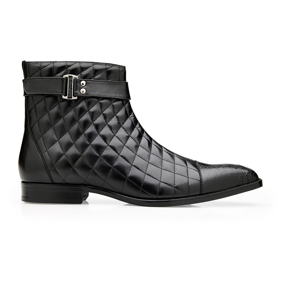 Elevate your style with the Belvedere Libero Boots in Black, where refined craftsmanship meets bold design. These Chelsea ankle boots are made from genuine ostrich leg leather, paired with quilted leather panels that add a sophisticated touch. The deep black color enhances the boots' sleek silhouette, making them versatile enough for any occasion. The cap-toe detail provides a classic edge, while the side zipper ensures both style and ease of wear. Inside, the leather lining and cushioned insole offer superior comfort, and the leather sole delivers durability and a confident step. Whether you're dressing up for a night out or adding a touch of luxury to your everyday look, the Libero Boots are a statement of timeless elegance.