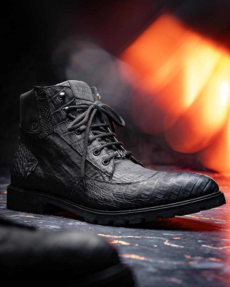 For a polished and professional look, pair these black caiman boots with a tailored suit or dress trousers. For a more contemporary outfit, combine them with dark jeans and a well-fitted blazer, allowing the luxurious texture and classic black color to enhance your ensemble.