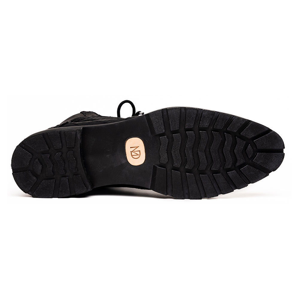 Step into unparalleled style with the Leoni Black Caiman Boots from Marco Di Milano. Crafted from genuine caiman crocodile leather in a striking black, these boots offer a sophisticated and versatile look. The full leather cushioned lining ensures all-day comfort, while the padded ankle adds extra support. With a signature lace ornament and a robust rubber outsole, these boots combine rugged durability with refined elegance, making them perfect for a range of occasions.