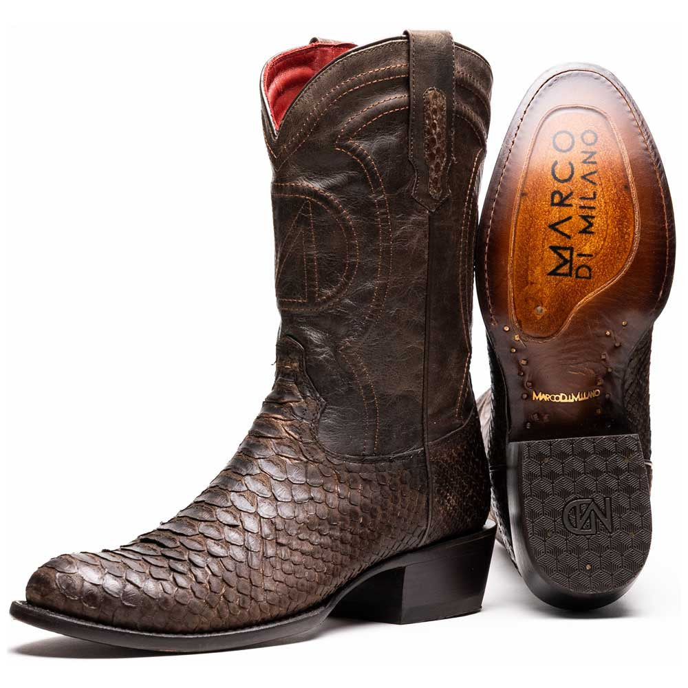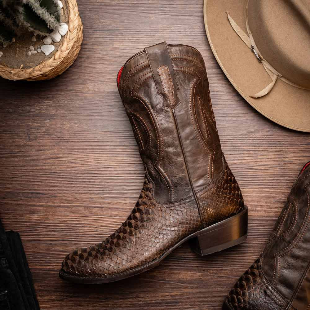 The KANSAS Brown Cowboy Boot blends authentic Western heritage with exotic luxury. Crafted from genuine brown python skin, the vamp reveals natural scale patterns in warm, earthy tones, complemented by a full-grain leather shaft with contrast stitching. The round toe design nods to cowboy tradition, while the signature red leather lining adds a refined touch. Finished with a hybrid leather and TPU sole for lasting comfort, the KANSAS Brown offers rugged charm and elevated style, perfect for men who appreciate handcrafted detail.