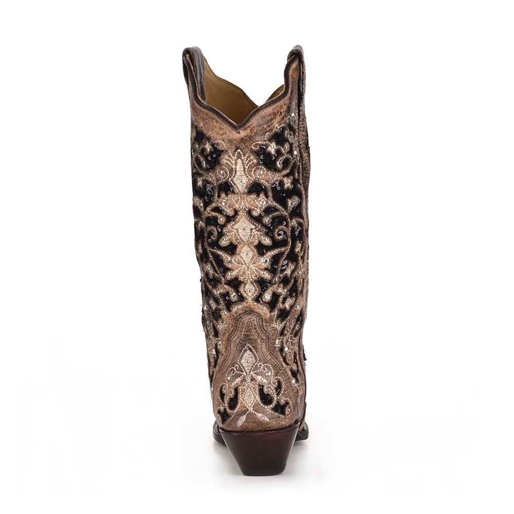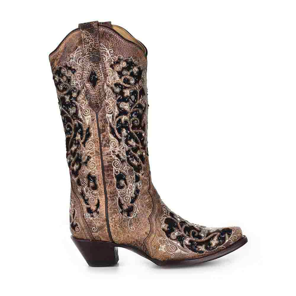These Corral boots are a versatile addition to your wardrobe. Pair them with your favorite denim for a classic cowgirl look or wear them with a chic dress for a more sophisticated ensemble. The black glitter inlay and crystal embellishments add a touch of glamour to any outfit. Whether you're attending a western-themed event or a night out with friends, these boots will keep you comfortable and stylish all day long.