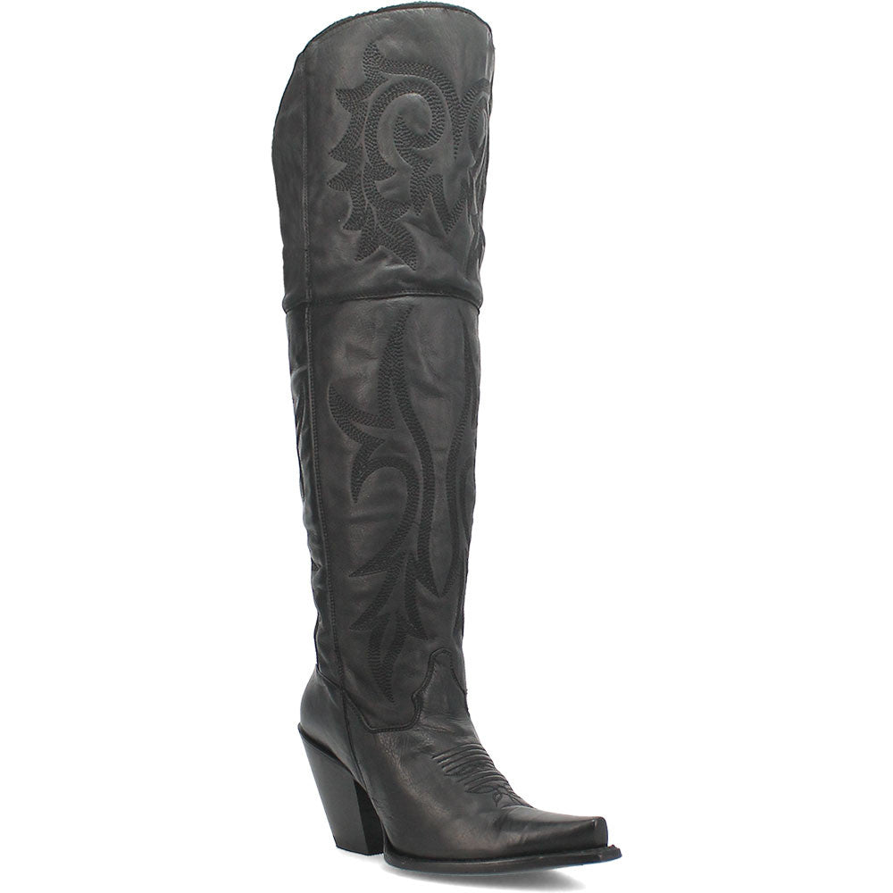 Make an unforgettable entrance in the Dan Post Jilted boot - a stunning over-the-knee masterpiece designed for those who dare to stand out. Crafted from soft, distressed leather, it perfectly balances vintage charm and high-fashion attitude. The intricate western stitching adds a touch of tradition, while the snip toe and 2 1/4" high-fashion heel create a sleek, leg-lengthening effect. With an inside zipper for easy wear, these boots are your go-to for bold, confident style.