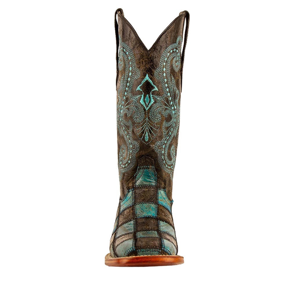 Make a bold fashion statement with Ferrini "Patchwork" boots, designed for the cowgirl who loves to stand out. The distressed full grain leather combines black with hot turquoise, hand-sewn into an eye-catching patchwork design that turns heads. Featuring a square toe for comfort and a 1.5" block heel for added stability, these boots are both stylish and functional. The distressed leather shaft and studded pull tabs complete the look, offering a blend of rugged charm and fun style.