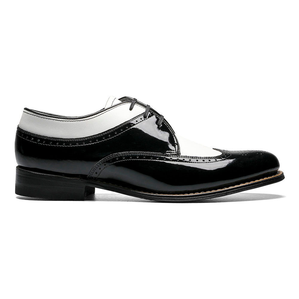 The Stacy Adams Dayton Black & White Patent Lace-Up elevates the traditional wingtip to a new level of sophistication. Featuring a sharp contrast between black poromeric patent leather and smooth white leather, this shoe captivates from every angle. The meticulous Goodyear welted construction and genuine leather sole promise longevity and performance, while adherence to environmental standards by sourcing leather from certified tanneries speaks to the brand's sustainable ethos.