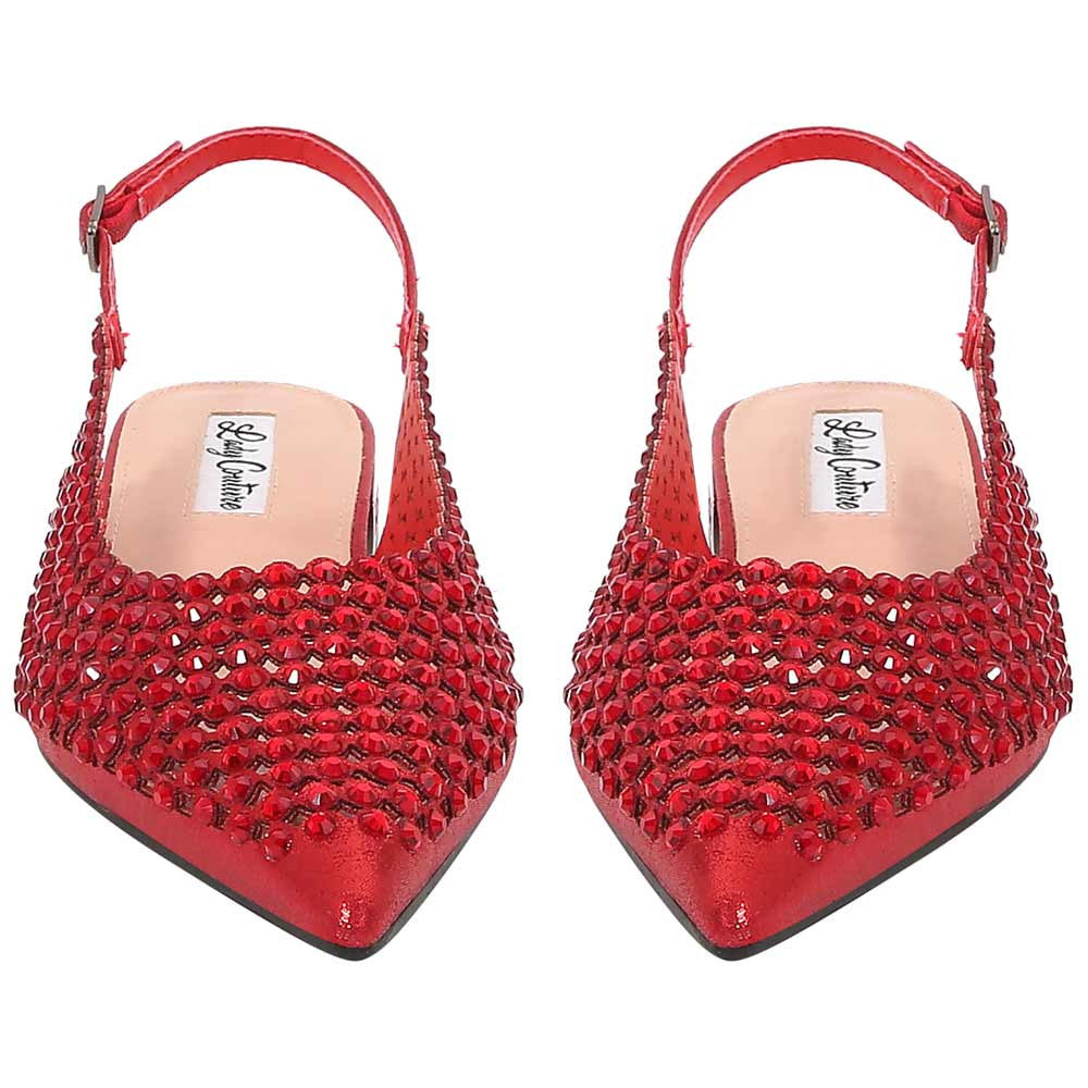 Ignite your stride with the Emmy 0.75" Red flat-where passion meets polish. Lady Couture Shoes weaves ruby rhinestones into a dazzling pointed-toe silhouette with a slingback strap for elegance on the go. The bold hue commands attention, while the soft cushioning ensures long-lasting ease. Perfect for occasions where you want to stand out-Valentine's dinners, cocktail parties, or any day you need a little more fire in your step.