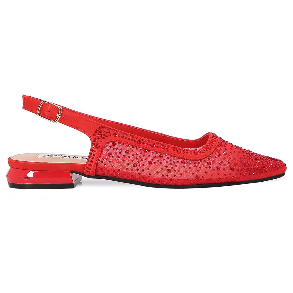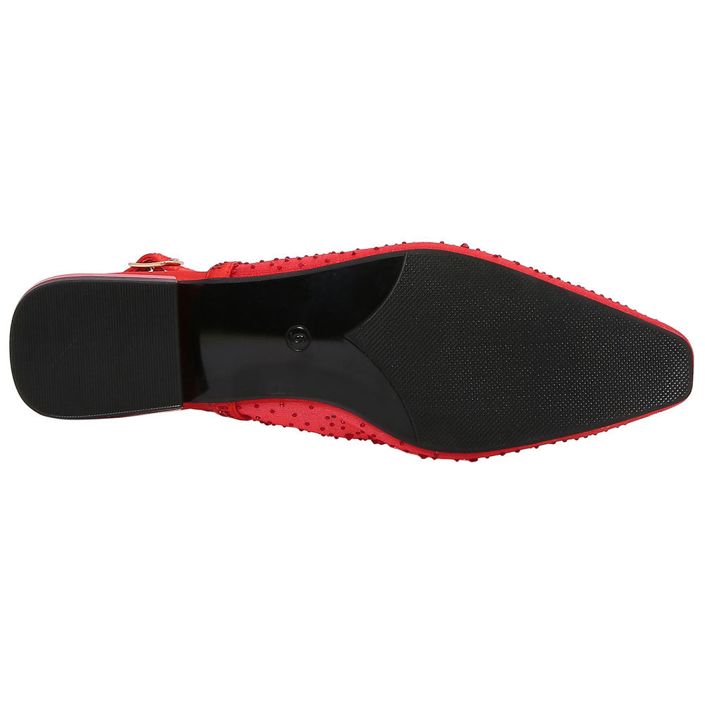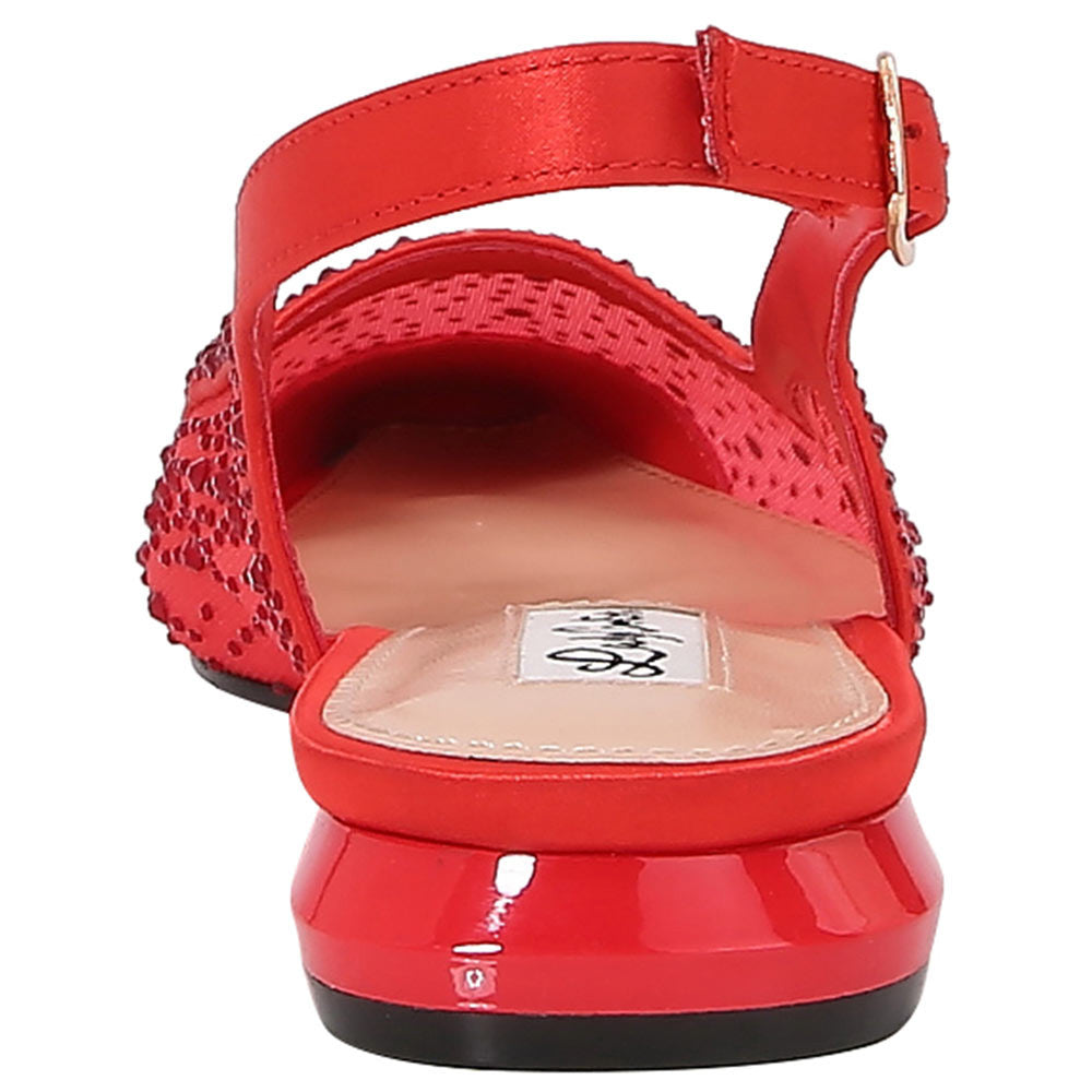 Make a fearless statement with the Lady Couture Kara Flat in red. Crafted with a shimmering rhinestone-embellished satin and mesh upper, this style delivers all the drama without the height. The snipped almond toe and slingback strap create a refined silhouette, perfect for women who love comfort with edge. Whether it's a gala or an elegant dinner, these Lady Couture Shoes offer a punch of red-hot glamour with every step. Style meets sparkle most boldly.