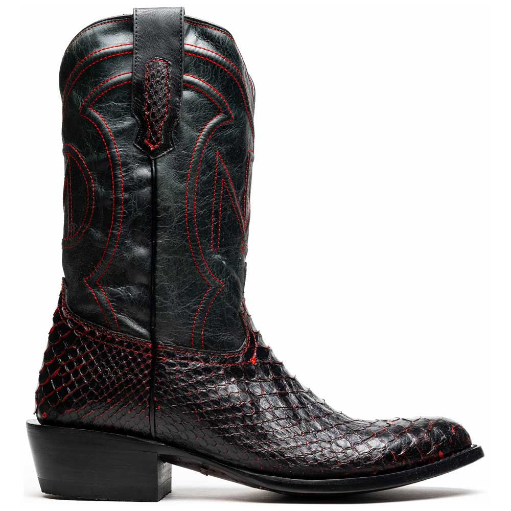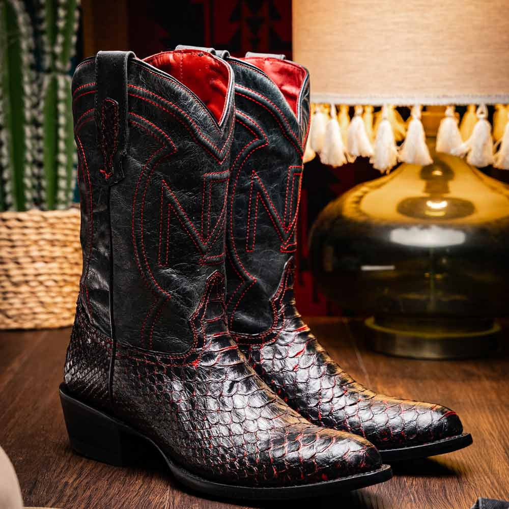 The KANSAS Black Cherry Cowboy Boot combines the untamed allure of genuine python skin with the sophistication of luxury Western design. Its deep black cherry hue brings out the natural texture of the exotic scales, creating a bold yet refined look. The full-grain leather shaft features clean contrast stitching, while the round toe keeps its silhouette rooted in cowboy tradition. Finished with a signature red leather lining and a sturdy hybrid sole, the KANSAS delivers comfort, style, and craftsmanship in equal measure.