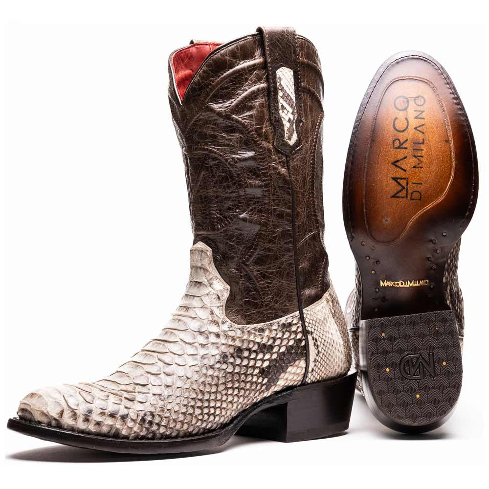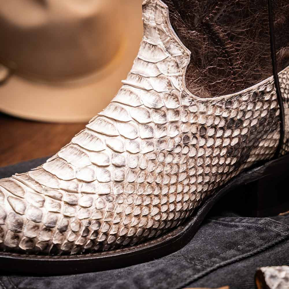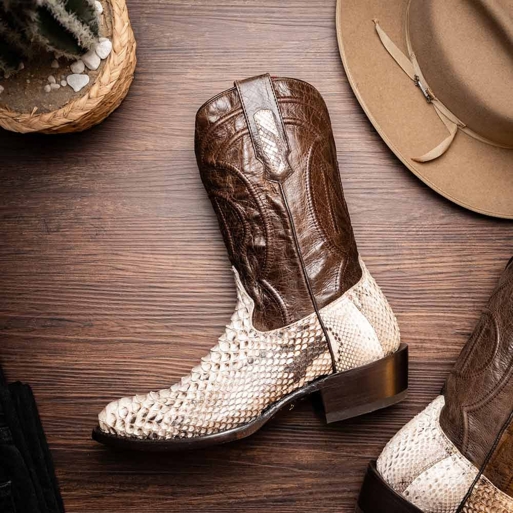 The KANSAS Natural Cowboy Boot showcases the raw beauty of genuine python skin in its most authentic form. The vamp's natural hue reveals every intricate scale detail, offering a versatile look that pairs effortlessly with a variety of colors and styles. A full-grain leather shaft with contrast stitching adds Western character, while the round toe preserves traditional cowboy appeal. Completed with a signature red leather lining and a sturdy hybrid sole, the KANSAS Natural blends rugged exotic texture with refined craftsmanship.