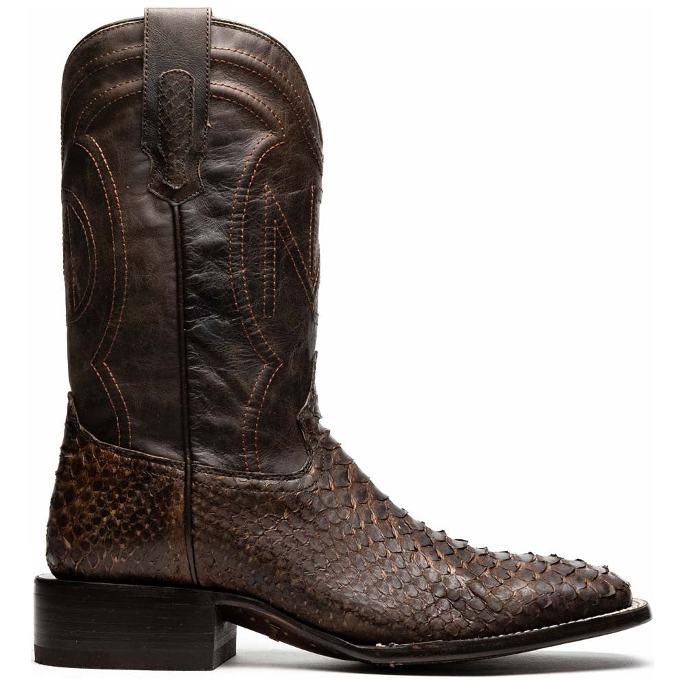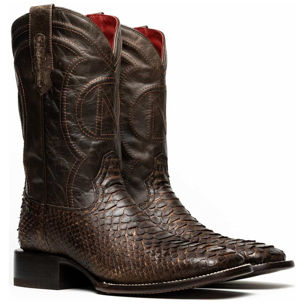 The MISSOURI brown boot is a powerful fusion of Western tradition and modern refinement. Handcrafted from genuine python skin on the vamp, its naturally intricate scales create a striking contrast against the rich brown full-grain leather shaft. A modern square toe adds a confident edge, while the signature red leather lining offers a luxe interior finish. The durable leather/TPU hybrid sole ensures lasting wear and comfort. Built for the man who commands attention, this boot is as bold as it is timeless.