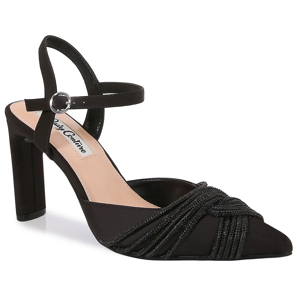 Step into elegance with the Lady Couture Fay Pump in classic black. Crafted with a shimmering rhinestone-embellished satin upper and a sharply pointed toe, this pump delivers refined glamour with every step. The slender 3.5-inch heel adds just the right height, while the adjustable strap ensures a secure fit. Whether it's a black-tie affair or an upscale evening out, Lady Couture Shoes offers timeless style and elevated confidence. The Fay pump is designed to turn heads with the utmost elegance.